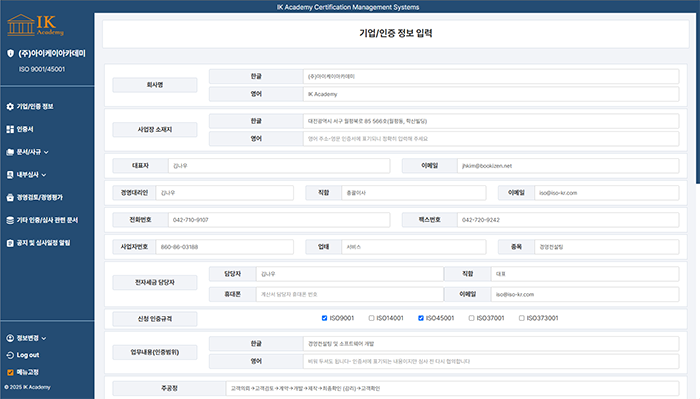 ISO 인증에 필요한 기업 정보를 간편하게 입력하고 관리할 수 있습니다.