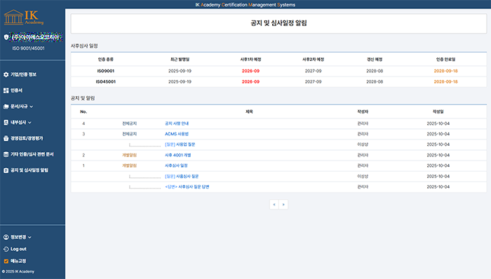 ISO 인증별 사후심사, 갱신심사 및 인증 만료일을 관리할 수 있습니다